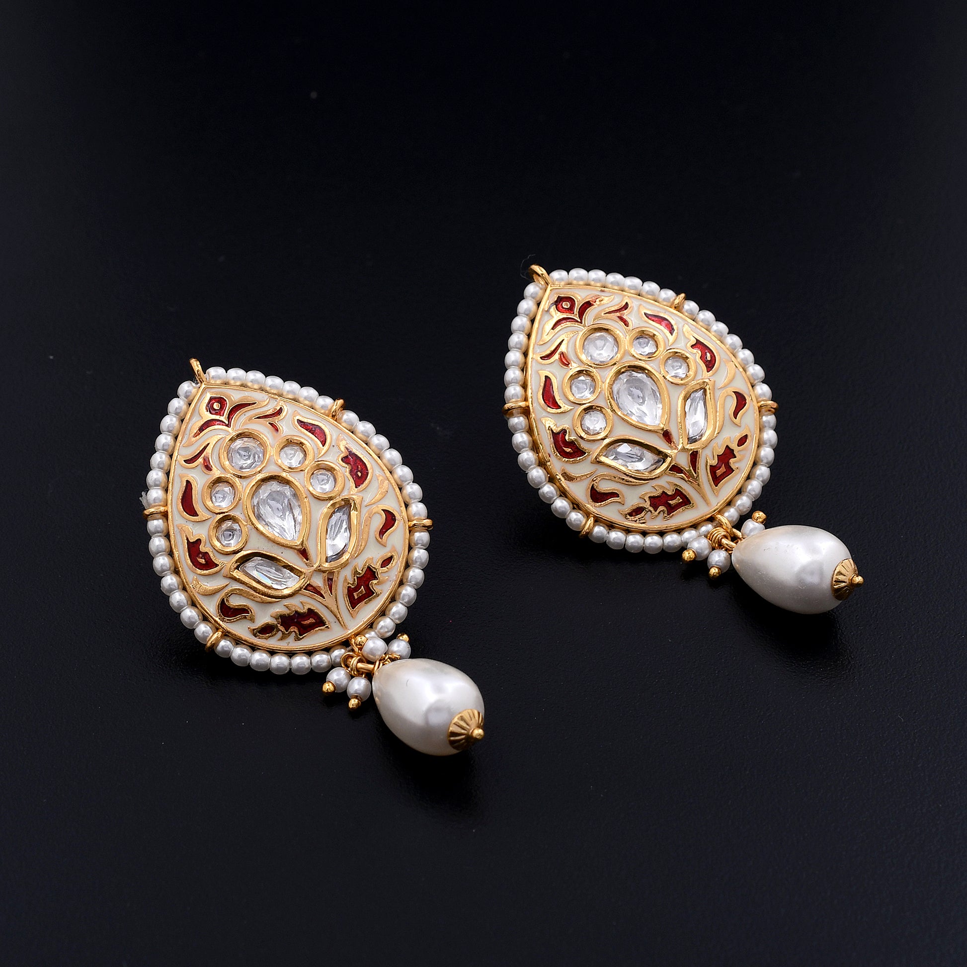 Adorn yourself with the allure of tradition through these Ruby Red Meenakari Pearl Drop Earrings. Their lustrous copper alloy foundation is meticulously handcrafted, featuring Polki work and Meenakari detailing that echoes the artistry of a bygone era. These earrings are a testament to timeless elegance and cultural reverence.