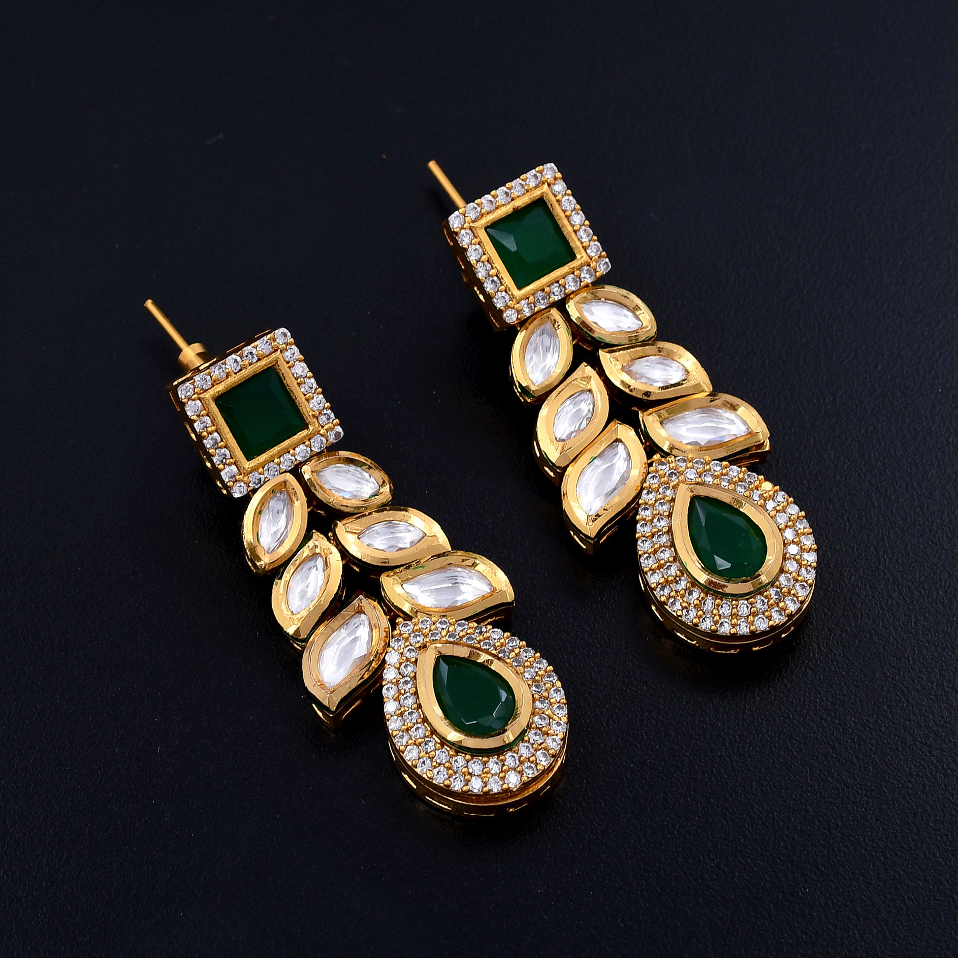 Adorn your ears with the allure of these emerald green studs, where Polki work meets diamond-like radiance in a copper alloy setting. Their grace and luster evoke the grandeur of heirloom-quality jewelry, making them a splendid choice for those who cherish artisanal elegance.