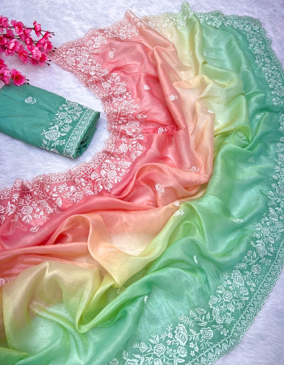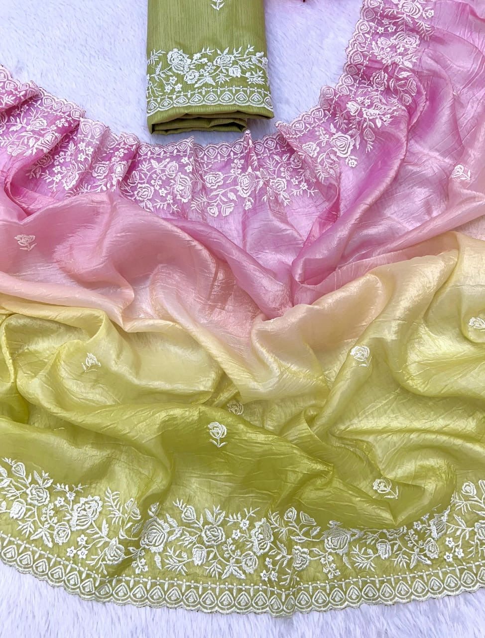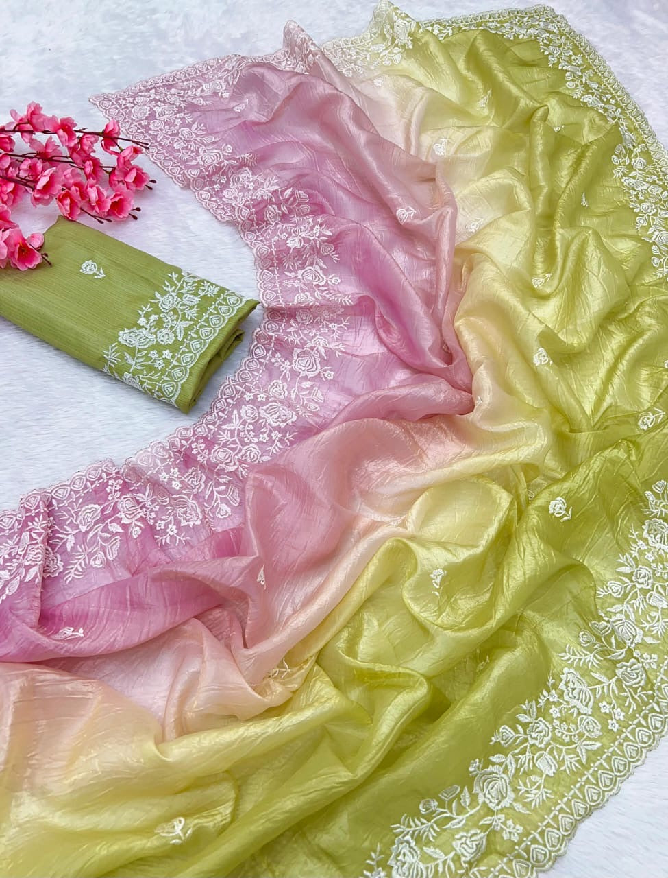 Unleash your inner goddess with the Gold Crush Silk 2D beautiful designer Thread Work Saree. This exquisite piece captures the essence of vibrant craftsmanship, enveloping you in a kaleidoscope of artistry that celebrates modern tradition. The stunning detailing, coupled with the luxurious pure satin silk blouse adorned in beautiful embroidery work, intertwines sophistication with a spirit of playful boldness. Perfectly designed to effortlessly transition from a grand celebration to an intimate gathering, this saree is not just a garment; it's a statement piece that empowers self-expression. Embrace the celebration of culture and elegance with every drape, making it a must-have addition to your wardrobe. Show the world your fearless style and rich heritage with this enchanting ensemble.