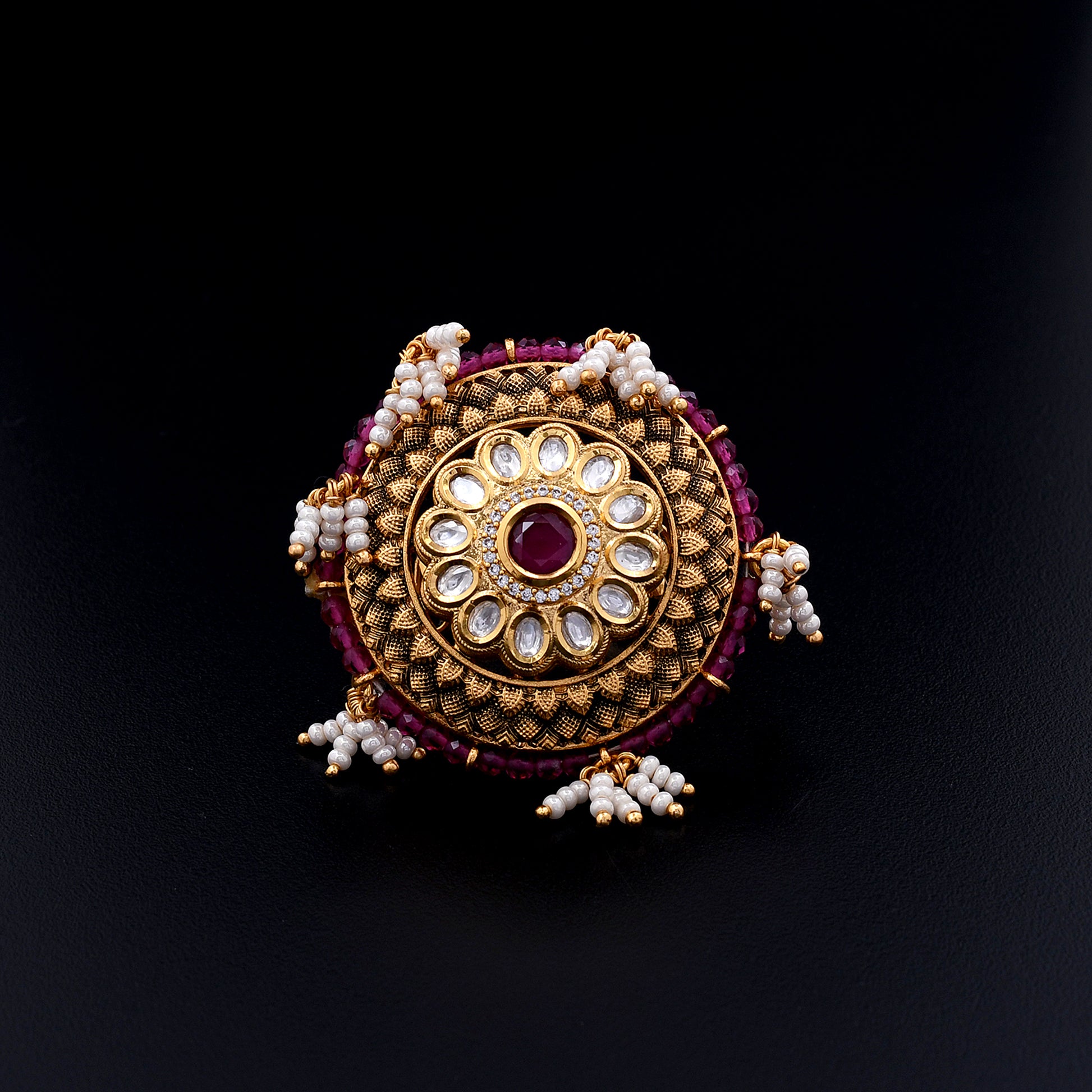 Adorn your hand with the Vihaan ring, a fusion of cultural splendor and artisanal finesse. This ruby red and ivory beaded Polki ring, with its intricate gold detailing, exudes a regal charm. Its lustrous copper alloy base and traditional Polki work reflect a heritage-rich craftsmanship, making it a compelling piece for any collection.